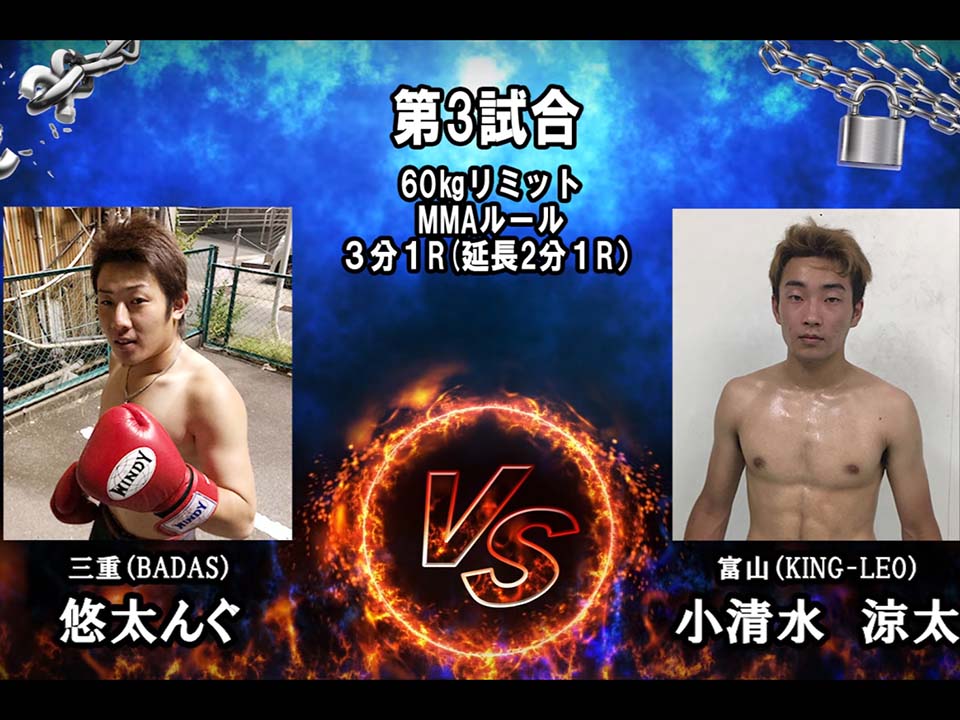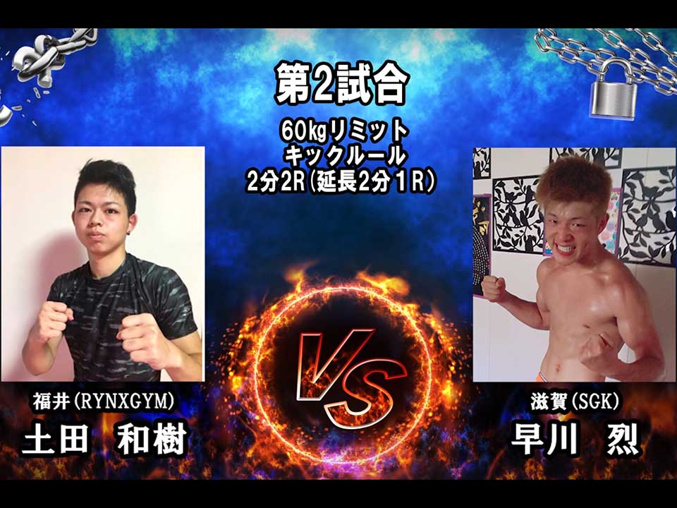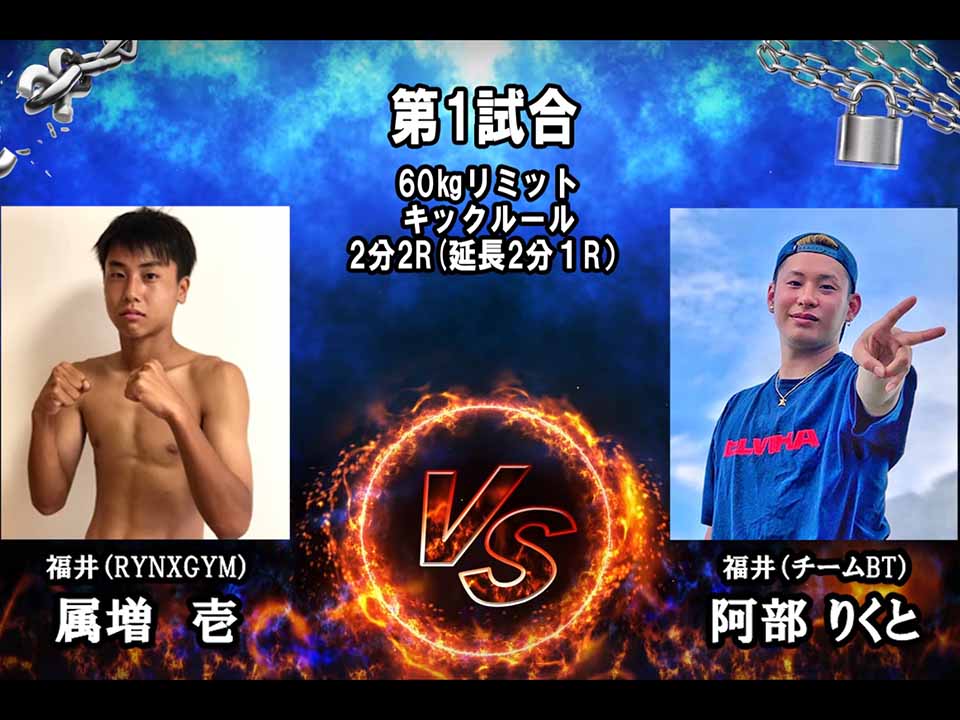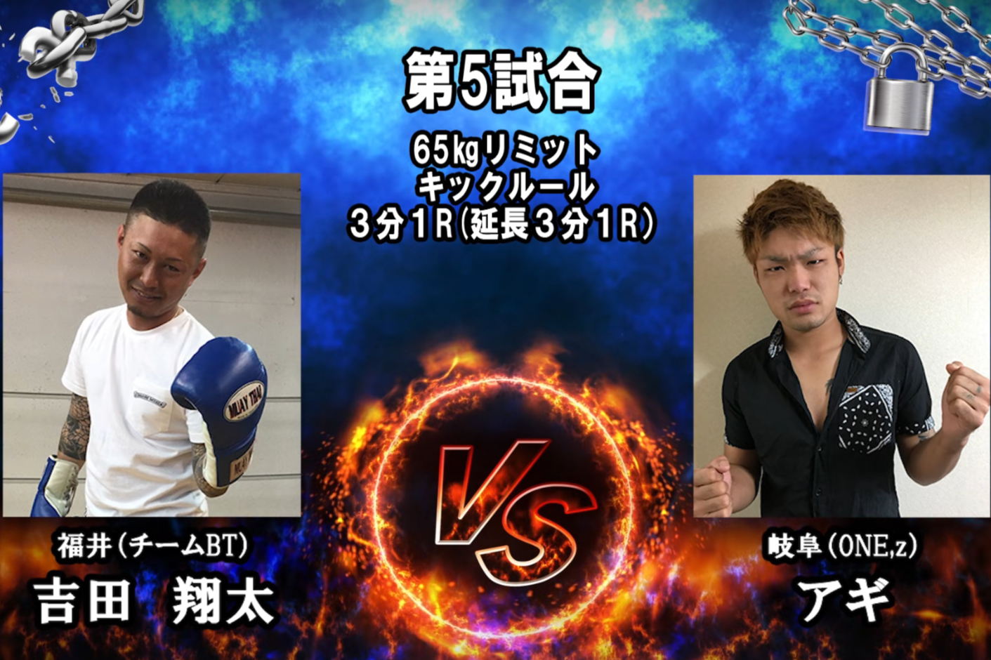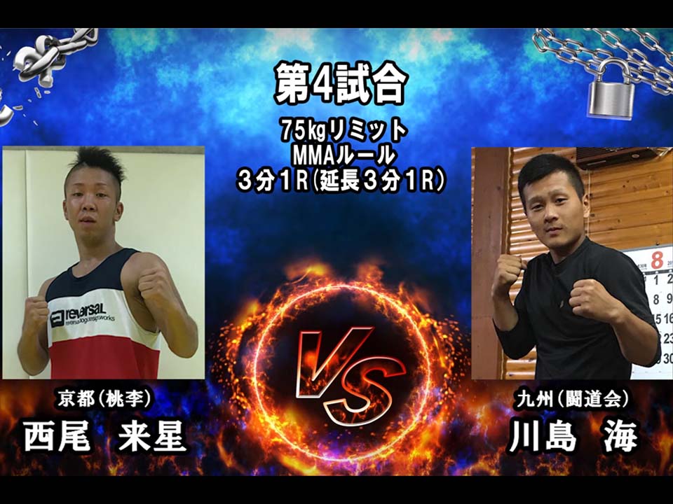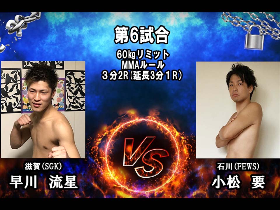 第1試合60kgリミットキックルール 第2試合60kgリミットキックルール 第3試合60kgリミットMMAルール 第4試合75kgリミットMMAルール 第5試合65kgリミットキックルール 第6試合60kgリミットMMAルール